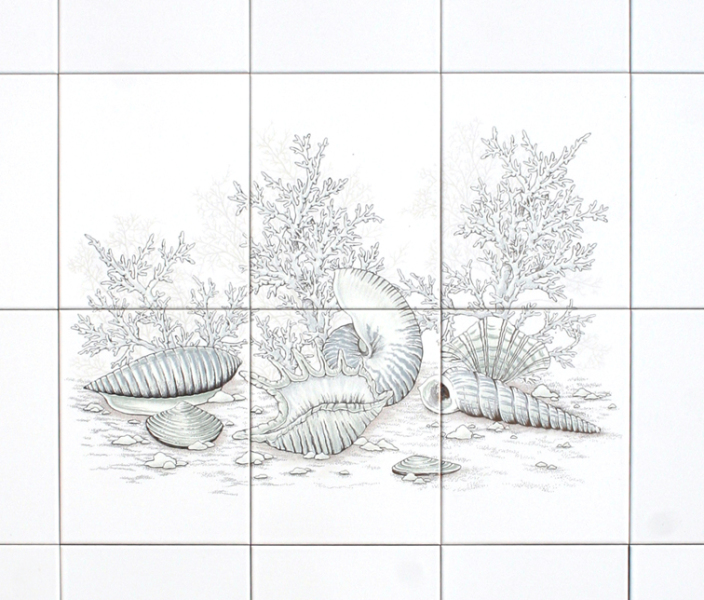 Das Dekor ist in dezenten Farben gefertigt. Die Muscheln haben einen hellen grau/grünen Farbton, die Korallen ein Reliefweiß. Auf dem Meeresboden schimmert ein zarter Perlmuttton. Die Konturen der Korallen, Muscheln und Steine sind mit Gold umgeben.