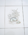 Das Bild ist in dezenten Farben gefertigt. Die Muscheln haben einen hellen grau/grünen Farbton, die Korallen ein Reliefweiß. Auf dem Meeresboden schimmert ein zarter Perlmuttton. Die Konturen der Korallen, Muscheln und Steine sind mit Gold umgeben.